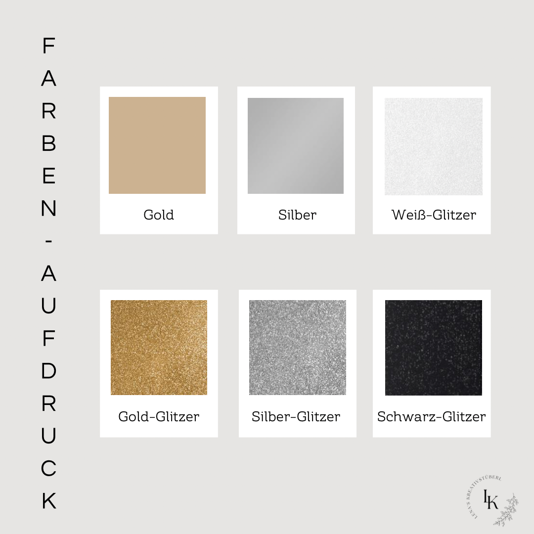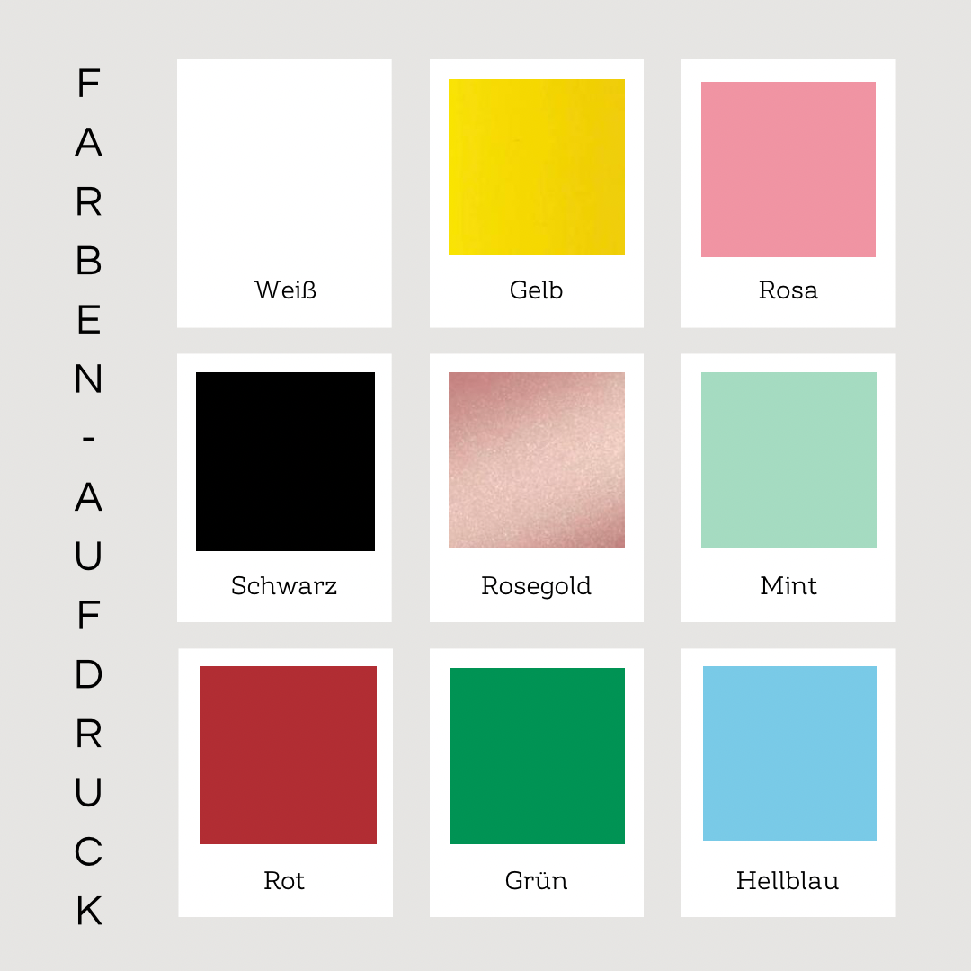 Gelb, Rosa, Schwarz, Roségold, Mint, Rot, Grün, Hellblau, Gold, Silber, Gold-Glitzer, Silber-Glitzer, Schwarz-Glitzer