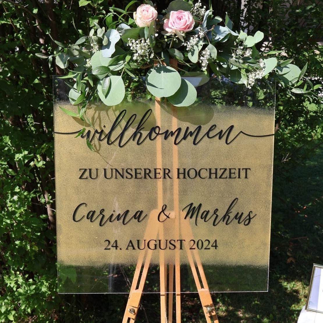 Begrüße Deine Gäste stilvoll mit diesem handgefertigten Hochzeitsschild aus transparentem Acrylglas. Das Schild ist mit einer eleganten Kombination aus moderner Schrift und persönlichem Text gestaltet. Ideal als Eingangsdekoration für Ihre Hochzeit oder als Erinnerungsstück für Zuhause. Individuell mit Namen und Datum personalisierbar.